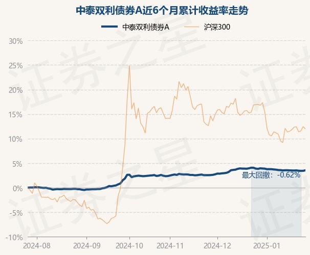 本站消息,1月27日,中泰双利债券A最新单位净值为1.0984元,累计净值为1.0984元,较前一交易日上涨0.09%。历史数据显示该基金近1个月下跌0.4%,近3个月上涨1.06%,近6个月上涨3.53%,近1年上涨6.13%。该基金近6个月的累计收益率走势如下图: